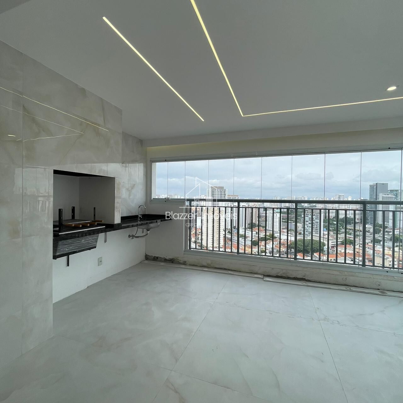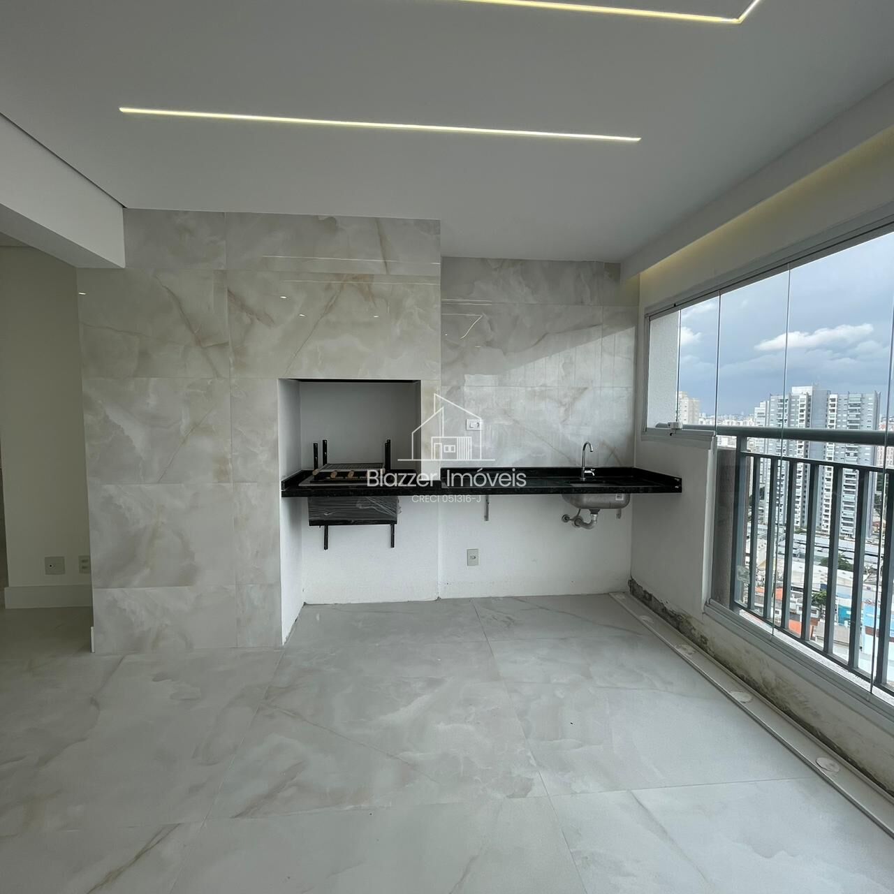 - Sala de estar e jantar integradas à varanda com churrasqueira a carvão